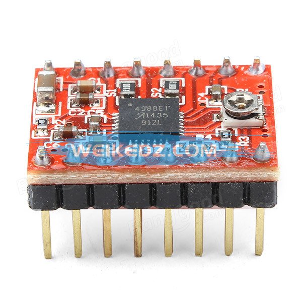 Description: A4988 is a complete microstepping motor driver with built-in translator for easy operation. This product is available in full, half, 1/4, 1/8 and 1/16 step modes operate bipolar stepper motors, output drive capacity of up to 35 V and ± 2 A. A4988 includes a fixed off-time current regulator, the regulator in slow or mixed decay modes. A4988 converter is the key to the easy implementation. As long as the "step" input inputting one pulse drives the motor one microstep. There are no phase sequence tables, high frequency control lines, or complex interfaces to program. A4988 interface is very suitable for complex microprocessor is unavailable or is overburdened.