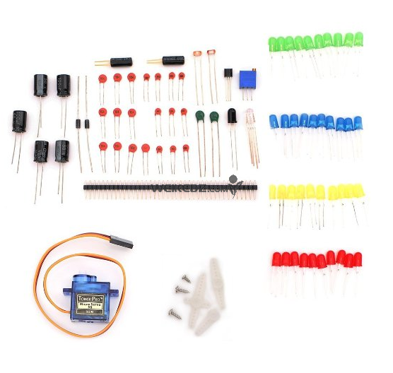 This kit is a new development kit, it contains multi-colors LED, resistors, capacitors, and other commonly used digital electronic components and small breadboard, do not include the control board. It is very suitable for electronics beginners.