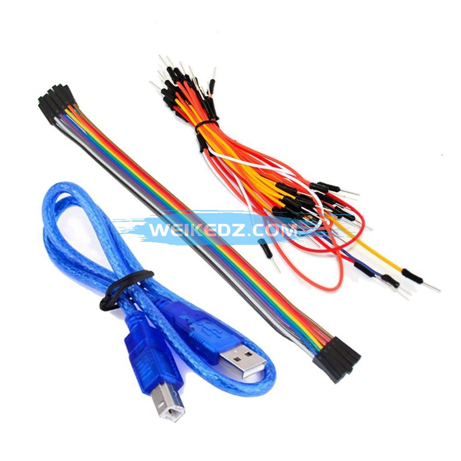 Kit list: 1 x UNO R3 1 x Sensor expansion V5.0 1 x USB cable 1 x Bluetooth module(slave) 1 x LCD1602 module 1 x 2 channel relay module 1 x RGB module 1 x 7 color flashing LED module 1 x 3W LED module 1 x Buzzer module 1 x Photosensitive resistor module 1 x 103 adjustable resistor module 1 x Breadboard 2 x 9g servos 1 x Plexiglass plate(10 x 20cm) 1 x 6 AA battery box 1 x Male to male jumper cable 1 x Female to female jumper cable 20 x Breadboard cable